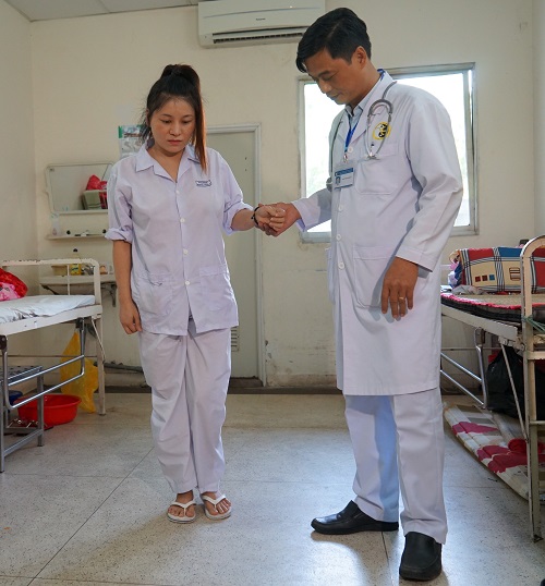 Sau một thời gian điều trị bằng phương pháp châm cứu, chị Vy đã tập tễnh đi lại được. Ảnh: Trần Ngoan.