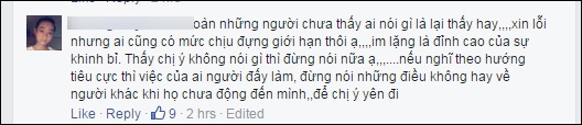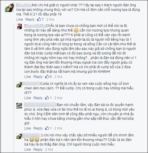 được chia làm hai nhánh, ủng hộ và "chĩa mũi" về phía Hà Hồ. Những bình luận đều chỉ trích vụ lùm xùm tình cảm của Hà Hồ và hơn nữa, một số anti-fan đã vào để lại những lời lẽ không hay buộc lòng nữ ca sĩ phải lên tiếng.