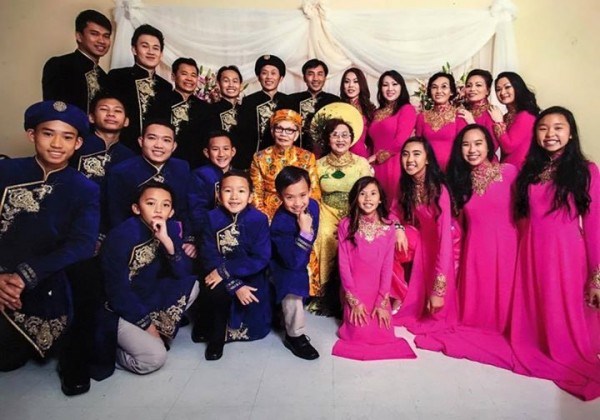 Không chỉ có bố mẹ cùng các anh chị em của Hoài Linh, bức ảnh đại gia đình này còn có sự xuất hiện đông đủ của anh rể, chị dâu và dàn cháu chắt nội ngoại vô cùng đông đúc. Theo đó, tổng số thành viên lên đến 24 người. Bố mẹ Hoài Linh có hai con rể, 1 cô con dâu, 4 cháu gái và 7 cậu cháu trai. Tất cả đều duyên dáng và rạng rỡ khi xúng xính trang phục áo Dài của Việt Nam. Có thể thấy sự hạnh phúc, nụ cười viên mãn và đầy tự hào của tất cả các thành viên trong gia đình.
