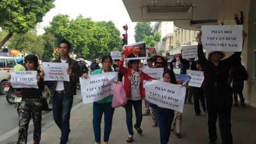 Một nhóm khoảng hơn 20 người đã tuần hành qua các trục phố Tràng Tiền - Hàng Bài - Lý Thường Kiệt và vòng lại về Nhà hát lớn. Họ cầm trên tay những biểu ngữ: “Vì một Việt Nam không lệ thuộc Trung Quốc”, “Phản đối Tập Cận Bình tới Việt Nam” và “Phản đối lệ thuộc Trung Quốc”.