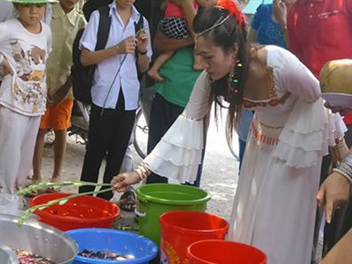 Ngồi trước bàn thờ, Châu ăn mặc cổ trang khá dị hợm như các bộ phim Trung Quốc. Châu cho biết, v́ là “công chúa Hằng Nga” tái thế nên mỗi khi chữa bệnh th́ phải ăn mặc như thế.