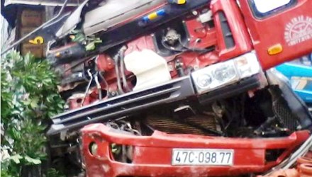 Chiếc xe tải tiếp tục lao vào nhà dân sau khi đã tông vào chiếc ô tô đậu bên đường. Bức tưởng căn nhà lập tức bị sập sau cú va chạm của xe tải. Vụ tai nạn khiến 2 người bị kẹt cứng tỏng cabin.