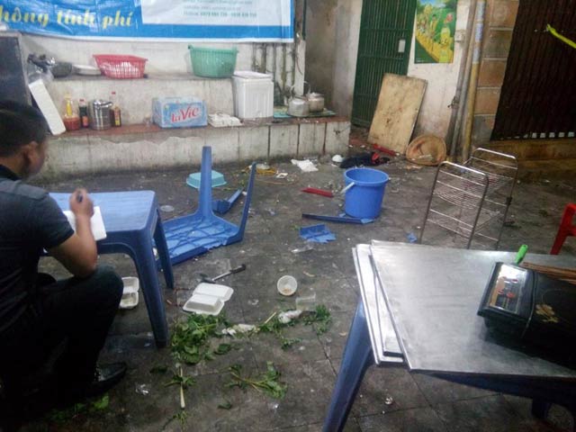 Trong lúc cán bộ công an này vẫn đang ở trong quán thì gần chục đối tượng bỗng xuất hiện, lao vào quán đập phá bàn ghế và tấn công vợ chồng anh Phong.
