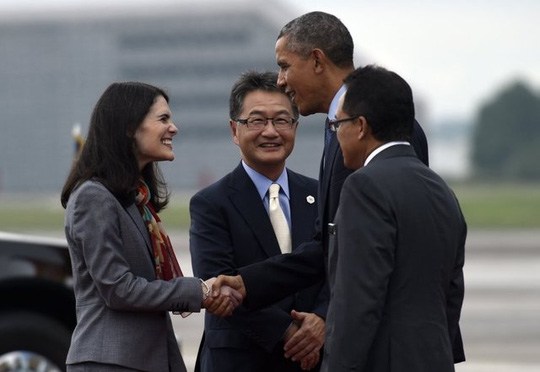 Tổng thống Mỹ Barack Obama bắt tay Đại sứ Mỹ tại ASEAN Nina Hachigian sau khi tới Căn cứu không quân Subang tại Kuala Lumpur, Malaysia hôm 20-11-2015. Ảnh: APĐó là thông tin được Đại sứ Mỹ tại ASEAN – bà Nina Hachigian – cho biết trong cuộc họp báo qua điện thoại với báo giới khu vực châu Á Thái Bình Dương hôm 2-12.