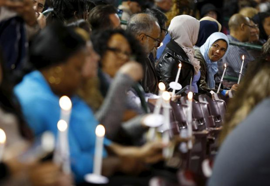 Cư dân TP San Bernardino tưởng nhớ những nạn nhân vụ xả súng hôm 3-12. Ảnh: Reuters