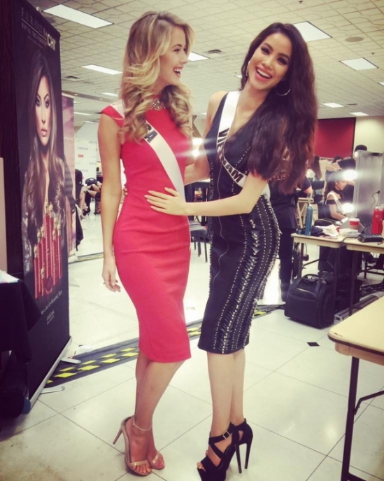 Biểu cảm "xì-tin" của Phạm Hương khi tham gia hoạt động bên lề của cuộc thi Hoa hậu Hoàn vũ với thí sinh nước bạn.