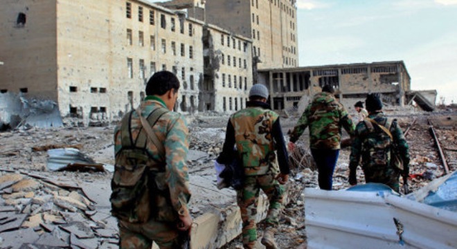 Binh sĩ Syria tiến vào một khu vực được giải phóng khỏi tay IS ở tỉnh Aleppo. Ảnh AFP