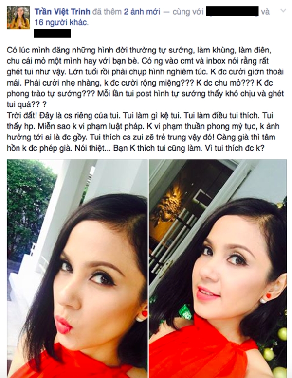 Mới đây, Việt Trinh đã bày tỏ sự bức xúc trên trang cá nhân khi bị cho là “cưa sừng làm nghé”. Người đẹp 7x cho biết khi đăng những bức ảnh “tự sướng” đời thường thì hay nhận được ý kiến bình luận và tin nhắn phê phán, chê trách và khuyên cô nên chụp ảnh nghiêm túc.