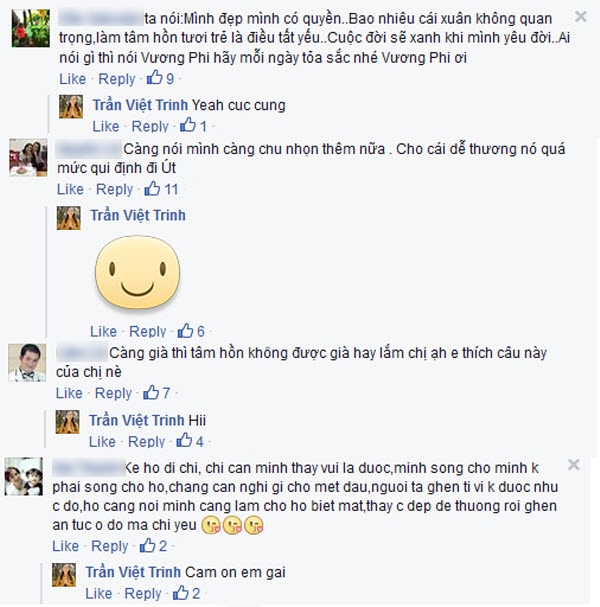 Việt Trinh thẳng thừng tuyên bố cuộc sống của riêng cô thì cô có quyền tự quyết định nên làm gì, miễn không vi phạm luật pháp hay thuần phong mỹ tục. Nữ diễn viên “Người đẹp Tây Đô” cũng khẳng định mình thích sự vui vẻ trẻ trung và càng già thì tâm hồn lại không được già.