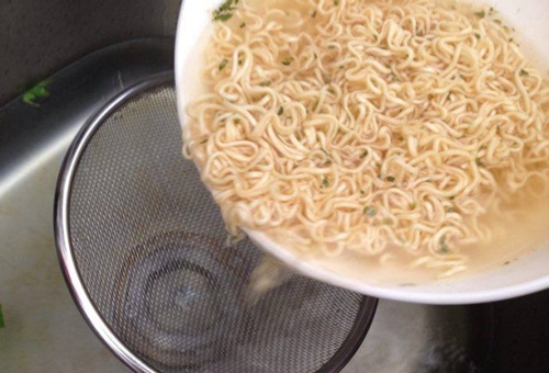 Vì vậy, hãy dùng nước sôi trần qua mì tôm để lọc chất xám cũng như lớp dầu chiên mì. Khi các sợi mì rời nhau và chín đều thì bạn hãy đổ bỏ nước sôi và trút mì ra bát. Sau đó, để nồi nước sôi khác, đổ mì vừa gắp ra bát vào lại nồi, nhanh tay tắt bếp để mì không bị nát.