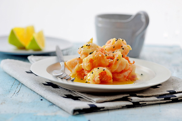 Gắp tôm đă ráo dầu ra đĩa, rưới nước sốt cam bơ lên, trên cùng rắc ít vừng đen đă rang thơm.