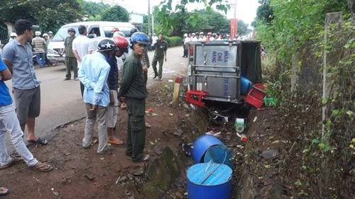 Sau khi đâm vào 2 chiếc xe máy, chiếc xe tải chở cá cũng rơi xuống mương nước và lật nhào, tài xế và phụ xe chỉ bị thương nhẹ và được người dân hỗ trợ đưa ra khỏi xe.