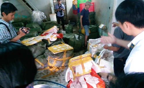 Tại đây đoàn liên ngành phát hiện hàng chục bao tải trên nên nhà rỉ ra thứ nước bốc mùi hôi thối. Đoàn liên ngành tiến hành kiểm tra các bao tải trên thì phát hiện nhiều thùng xốp mang nhãn Trung Quốc chứa nầm heo, thịt ba rọi với số lượng gần 2,1 tấn