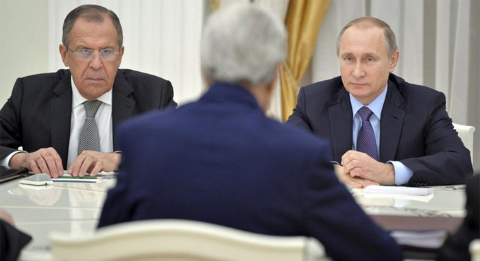 Ngoại trưởng Mỹ John Kerry đối thoại với người đồng cấp Nga Sergei Lavrov và Tổng thống Putin. (Ảnh: Reuters)