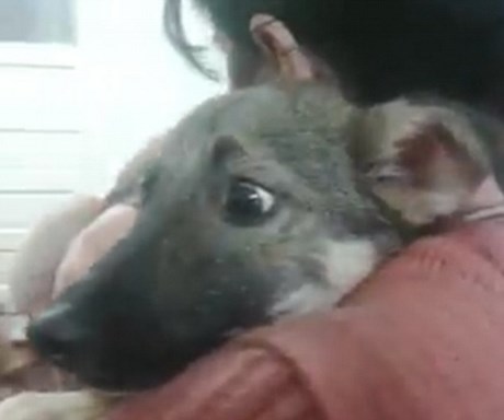 Ánh mắt sợ hãi của chú chó khi được một người ôm vào lòng.