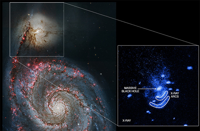 Đó chính là một siêu lỗ đen (còn gọi là hố đen) khổng lồ đã trải qua quá trình bùng phát năng lượng, bức ảnh dưới đây chụp lại ảnh của ngân hà M51 và một phần nhỏ khu vực NGC 5195.
