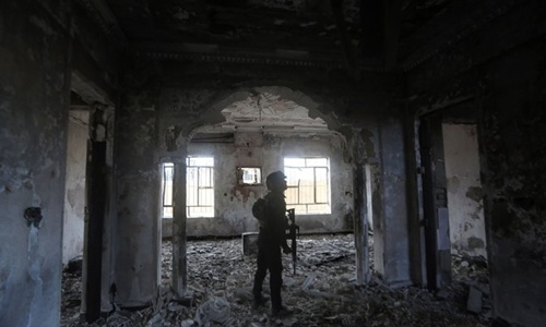 Khu phức hợp hành chính ở trung tâm thành phố vẫn vắng bóng người. Chỉ có một nhóm nhỏ lính Iraq đứng canh gác vì IS vẫn tiếp tục nã pháo cối vào đây. Mặt tiền bằng kính của đồn cảnh sát phía ngoài toà nhà đã vỡ vụn.