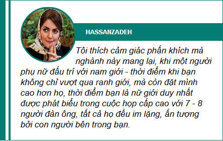 Tất nhiên, đó chỉ là thiểu số. Hassanzadeh bày tỏ, những người đàn ông làm việc trong ngành công nghiệp dầu mỏ đều rất tốt bụng. Họ vẫn luôn đối xử với cô theo kiểu "thực sự không thể tin rằng một người phụ nữ lại có thể thẳng thắn tới mức độ như bạn"".
