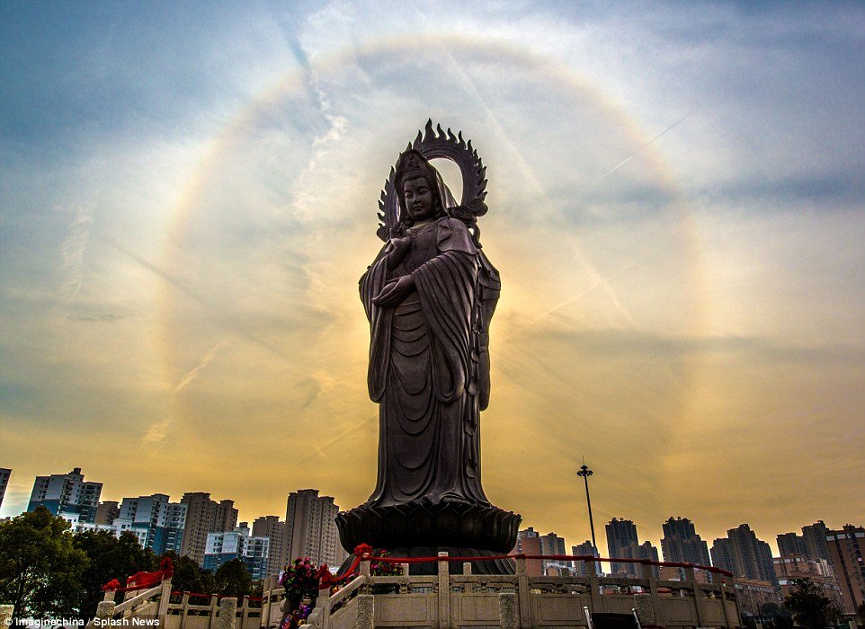 Một "phép màu" xuất hiện quanh Phật bà Quan âm Bồ tát ở chùa Quy Nguyên, Trung Quốc vào hôm 26/1. Người dân tại đây đã vô cùng ngạc nhiên khi chứng kiến vầng hHào quang ngũ sắc hiện quanh bức tượng. Người dân từ các nơi đổ về vái lạy và coi đây là một hiện tượng thiêng liêng và ai chứng kiến sẽ gặp được nhiều may mắn.