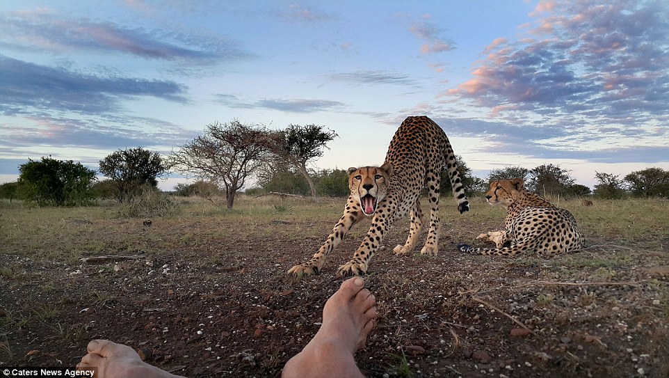 Theo tin tức từ DailyMail, trong chuyến tham quan khu bảo tồn Mashatu ở Botswana, nhiếp ảnh gia Kim Wolhuter (57 tuổi) đã có một hành động vô cùng táo bạo khi để con báo liếm ngón chân của mình.