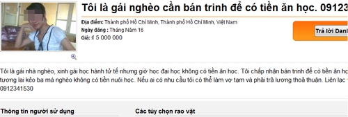 Cô gái này đã rao bán “cái ngàn vàng” với giá 25 triệu đồng trên mạng xã hội. Lí do cô đưa ra là để đóng học phí. Đây không phải là lần đầu tiên những mẩu tin bán thân này xuất hiện.