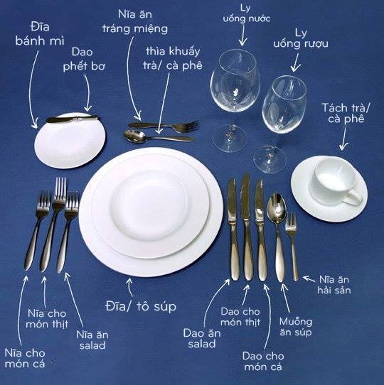 9. Làm quen với các món đồ trên bàn: Ở các bữa ăn trang trọng, bạn sẽ thấy rất nhiều dao, nĩa, thìa dành cho các món ăn khác nhau. Hãy ghi nhớ công dụng của từng món. Nếu không nắm chắc, hãy bắt đầu sử dụng các dụng cụ từ phía ngoài vào. Thông thường, các món ăn đặc thường ở bên trái, còn các món súp và đồ uống sẽ nằm ở phía bên phải. Các loại nĩa nằm ở bên trái, riêng nĩa ăn hải sản được đặt ở bên phải. Ly nước nằm ở bên trái ly rượu.