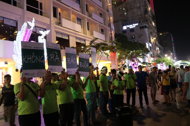 22 giờ, các bạn trẻ bắt đầu cầm bảng có thông điệp “Không xả rác bừa bãi” đi dọc phố đi bộ Nguyễn Huê, đồng thời dùng loa kêu gọi mọi người cùng chung tay giữ gìn vệ sinh chung bằng tiếng Việt và tiếng Anh.