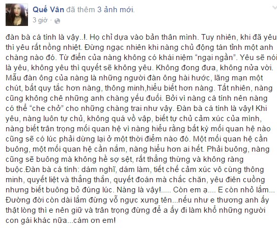 Sau khi công khai những tin nhắn đậm chất ngôn tình với Trường Giang, mới đây ca sĩ Quế Vân lại tiếp tục chia sẻ trên trang cá nhân những suy nghĩ của mình về đàn bà.