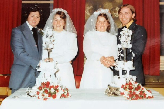 Hai cặp đôi Ann – Ron và Lynda – Derrick trong lễ cưới ngày 15-2-1975. Ảnh: SWNS