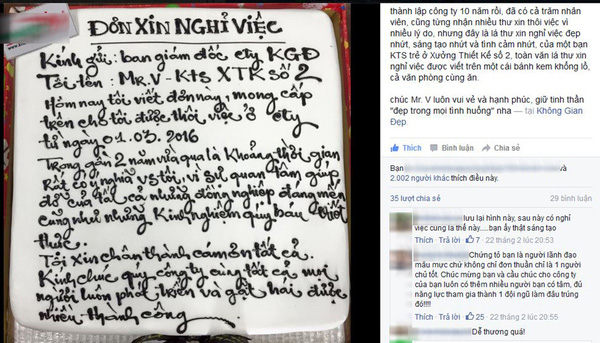 Toàn văn lá thư xin nghỉ việc được viết trên một cái bánh kem khổng lồ, cả văn phòng cùng ăn. Chúc Mr. V luôn vui vẻ và hạnh phúc, giữ tinh thần “đẹp trong mọi tình huống” nha!".