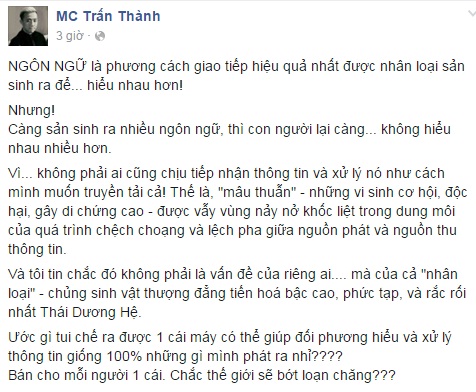 Kể từ ngày công khai chuyện t́nh cảm, Trấn Thành và Hari Won thường xuyên tay trong tay, sánh bước bên nhau tại hầu hết các sự kiện cũng như những cuộc chơi sau ánh đèn sân khấu. Tuy nhiên, không thể phủ nhận một điều rằng, sau những ǵ tốt đẹp c̣n đang hiện hữu, cả hai cũng vướng phải không ít những rắc rối từ phía công chúng và dư luận. Mới đây nhất, trên trang cá nhân của ḿnh, Trấn Thành bất ngờ đăng tải đoạn trạng thái khá dài nhằm đề cập đến vấn đề "có hiểu chuyện hay không". Theo đó, nam MC bày tỏ, "Ngôn ngữ là phương cách giao tiếp hiệu quả nhất được nhân loại sản sinh ra để... hiểu nhau hơn!