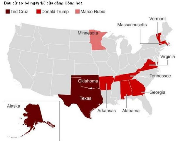 Trong cuộc đua của 5 ứng viên đảng Cộng ḥa, tỷ phú Trump chiến thắng tại 7 bang, gồm Arkansas, Georgia, Alabama, Massachusetts, Tennessee, Vermont và Virginia. Trong đó Georgia và Tennessee là các bang được phân bổ nhiều đại biểu dự đại hội toàn quốc đảng Cộng ḥa, lần lượt là 76 và 58, chỉ ít hơn Texas (155 đại biểu).