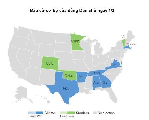 Theo kết quả khảo sát cử tri sau khi bỏ phiếu, bà Clinton đă chiến thắng tại 7 bang, gồm Georgia, Virginia, Alabama, Tennessee, Arkansas, Texas và Massachusetts, trong khi đối thủ của bà là Thượng nghị sỹ Sanders thắng tại 4 bang Vermont, Oklahoma, Colorado và Minnesota.