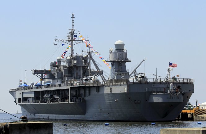 Soái hạm USS Blue Ridge neo tại Manila ngày 5-3. Đây là một trong những chiếc tàu được Mỹ điều đến Biển Đông thời gian gần đây. - Ảnh: Reuters