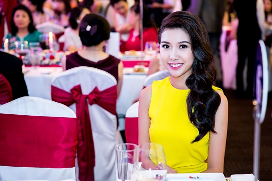 Sau buổi tọa đàm, Thúy Vân và các người đẹp cùng tham dự buổi tiệc tối với sự có mặt của nhiều doanh nhân nữ thành đạt. Mặc trang phục đầm vàng của NTK Lê Thanh Hòa, Thúy Vân tự tin trò chuyện với các người đẹp đến từ nhiều quốc gia.