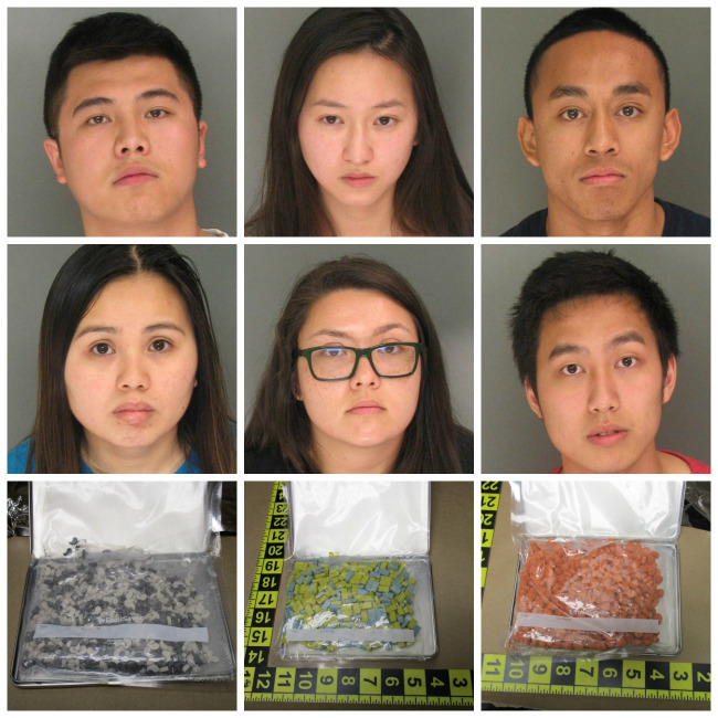 Nhóm sinh viên 21 tuổi bị bắt giữ tại ba địa điểm khác nhau ở thành phố Santa Cruz, và đều là thành viên hội nữ sinh viên Alpha Kappa Delta Phi hoặc Hội sinh viên Lambda Phi Epsilon. Nguyễn và Lê bị tình nghi sở hữu chất được kiểm soát, trong khi 4 sinh viên còn lại Dremel, Liu, Casil và Tiêu bị tình nghi âm mưu, và sở hữu chất được kiểm soát để buôn bán, phân phối, cảnh sát cho biết.
