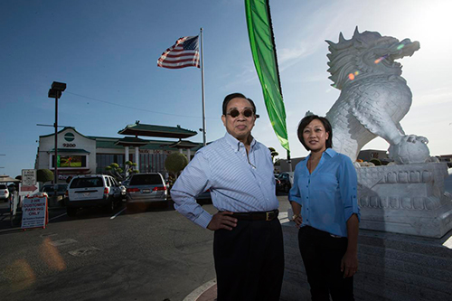 Ông Frank Jao và con gái Felicia trước Asian Garden Mall, còn gọi là Thương xá Phước Lộc Thọ. Ảnh: OC Register