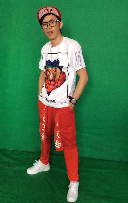 Hoài Linh đi giày thể thao, diện bộ đồ phong cách hip-hop và tạo dáng rất x́ tin trong một buổi họp báo hồi tháng 10.2014.