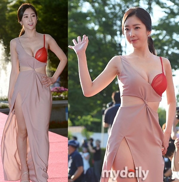 Trước Dương Cẩm Hoa, nhiều mỹ nhân cũng từng trải nghiệm phong cách bắt mắt này. Tại một sự kiện quảng bá phim mới ở Bắc Kinh, Liễu Nham diện bộ đầm hồng cánh sen khoe nội y đen hết sức táo bạo, giúp tôn lên vòng một gợi cảm và quyến rũ.
