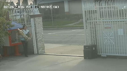 Hình ảnh từ camera giám sát cho thấy bà Trang Thu Pham trộm các bức tượng Phật ở chùa Trúc Lâm Yên Tử, Santa Ana. Ảnh: My News LA
