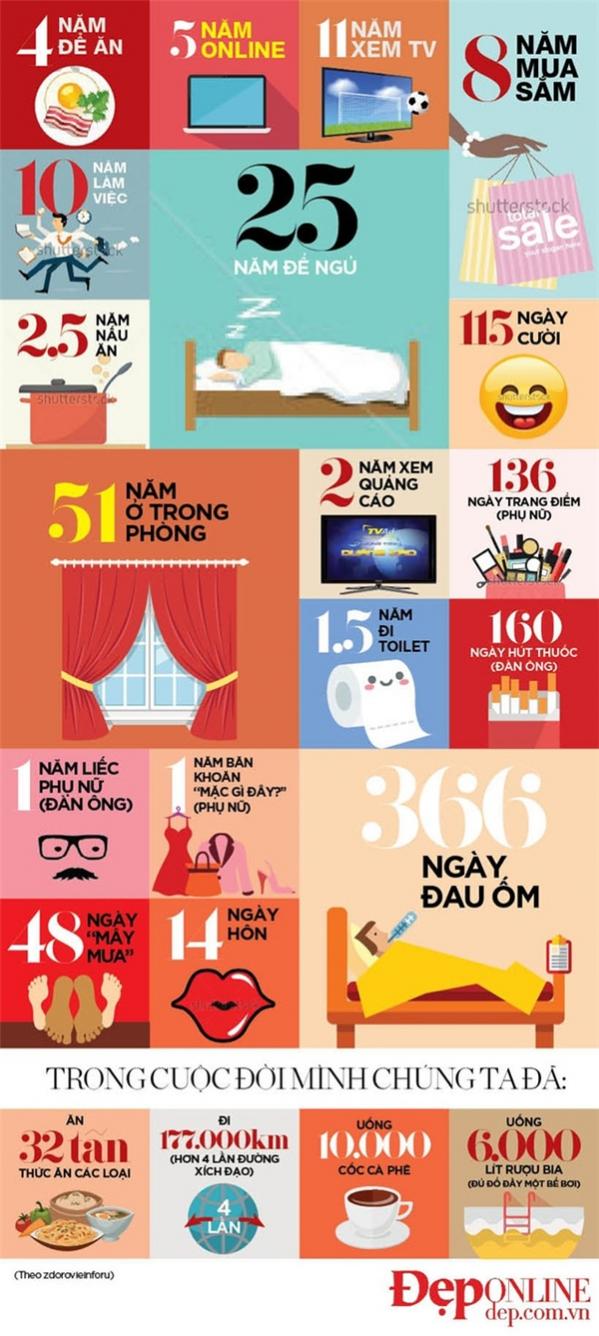 Bạn có bao giờ tự hỏi trong cả cuộc đời mình có bao nhiều thời gian ăn, bao nhiều thời gian ngủ,… Bài viết này sẽ giải đáp thắc mắc đó cho bạn . Và còn rất nhiều điều thú vị nữa nữa đấy.