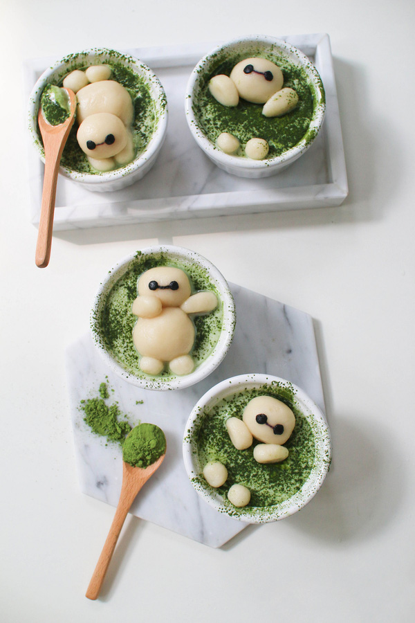 Khi pudding đã đông, rắc 1 chút bột matcha lên trên sau đó xếp hình Baymax lên trên mặt.