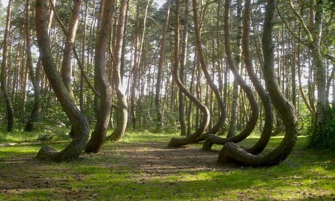 Khu rừng cong (Crooked Forest) tại West Pomerania, Ba Lan, là vùng đất chứa khoảng 400 cây thông uốn cong 90 độ ở gốc, trong khi thân cây mọc thẳng đứng. Nguyên nhân gây ra hiện tượng trên đến nay vẫn chưa được làm rõ. Một giả thuyết được đưa ra là một nhóm người nào đó uốn các cây sau khi trồng chúng vào năm 1930. Họ hy vọng có thể sản xuất đồ nội thất từ những cây cong và can thiệp vào quá trình phát triển khi cây non 10 tuổi. Nhưng Thế chiế II bùng nổ ngăn cản họ thu hoạch gỗ, để lại cánh rừng kỳ lạ như ngày nay. Ảnh: Wikimedia Commons.