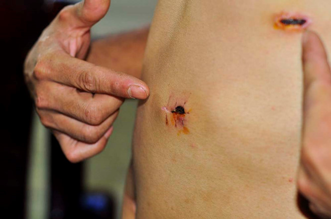Sau đó anh Hưng được người nhà đưa vào Bệnh viện Đa khoa Thống Nhất (Đồng Nai) cấp cứu ngay trong đêm. Tại đây, các bác sĩ phẫu thuật, gắp ra tổng cộng 4 đầu đạn cao su ở các vị trí vùng bụng, ngực và mông.