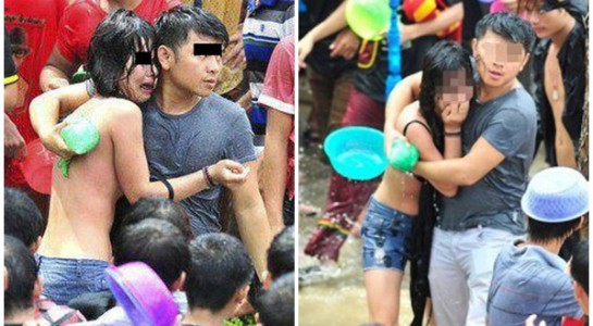 Vào năm ngoái, một cô gái người Thái Lan vui vẻ tham gia lễ hội té nước cùng bạn bè. Không may là cô gái đã bị một nhóm thanh niên sàm sỡ và lột tung chiếc áo. Sự việc nhanh chóng được chia sẻ khiến nhiều người phẫn nộ. Ngay sau đó, cô đã được bạn trai và cơ quan chức năng bảo vệ.