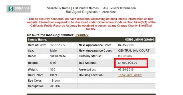 Số tiền để Minh Béo được tại ngoại theo công bố của Văn phòng Ủy viên công tố Quận Cam là 1 triệu USD.