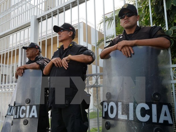 Cảnh sát gác bên ngoài văn phòng đại diện của Công ty luật Mossack Fonseca ở Lima. (Nguồn: AFP/TTXVN)