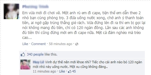 Nguyên văn dòng trạng thái P.T chia sẻ trên trang cá nhân: "Em vừa mới đi chơi về. Một anh rủ em đi cafe, tiện thể em dẫn theo 2 nhỏ bạn cùng phòng trọ. 3 đứa uống nước xong, chờ anh thanh toán tiền, ai ngờ gặp đúng thằng giẻ rách. Vừa đứng lên đi ra thì em bị gọi lại nói không mang đủ tiền, chỉ có 120 ngàn đồng. Lần sau các anh không đủ tiền thì cũng đừng mời em đi cafe nữa. Mệt cả đám nghèo mà trèo cao".