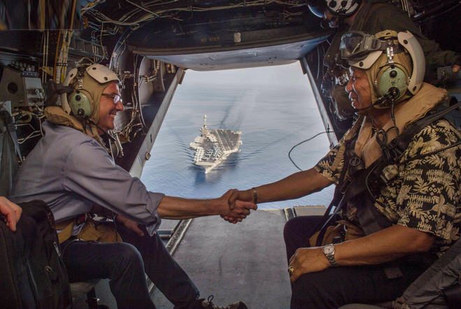 Bộ trưởng quốc phòng Mỹ Ashton Carter (trái) cùng người đồng cấp Philippines Voltaire Gazmin bắt tay trên máy bay trực thăng V-22 Osprey của Mỹ, sau khi thăm tàu sân bay USS John C. Stennis trên biển Đông hôm 15/4. (Ảnh: BQP Mỹ)