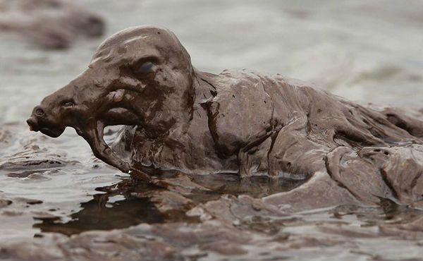 Chim biển bị ngập trong dầu từ sự cố tràn dầu. Những loài sinh vật biển bị ảnh hưởng bởi dầu tràn hầu hết đều sẽ chết nếu không có sự can thiệp của con người.